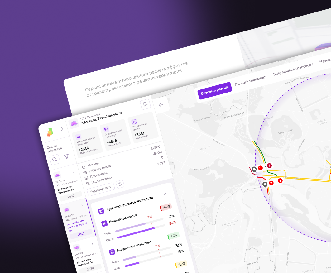 Сервис для автоматизированного экспресс-анализа транспортных эффектов от градостроительного развития территорий. Проводится оценка индивидуального, городского и скоростного внеуличного транспорта. По рассчитанным результатам автоматически предлагаются решения негативных эффектов