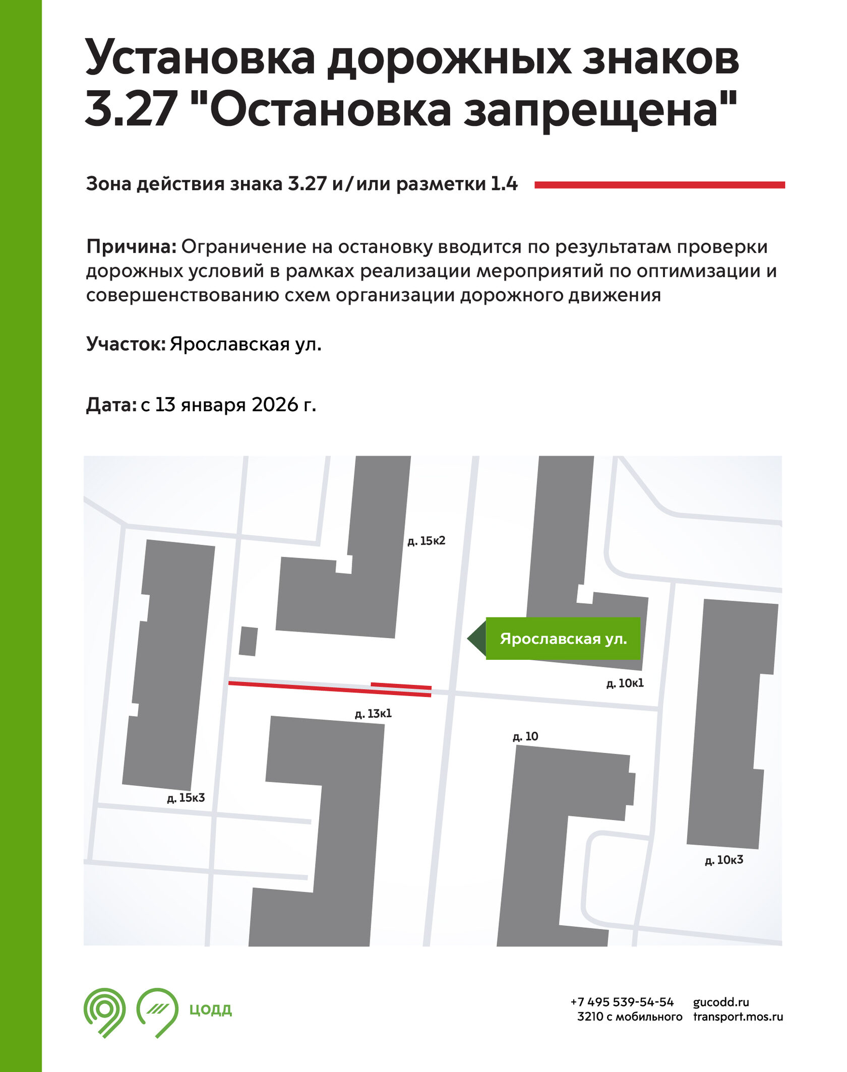 С 13 января 2026 года на улице Ярославская в Северо-восточном округе начнет действие знак 3.27 «Остановка запрещена».