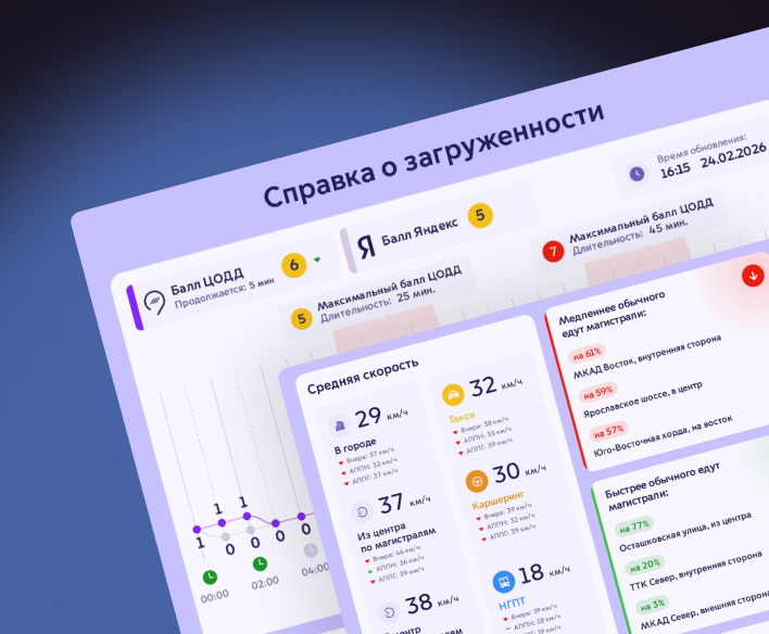 Телеграм-бот для руководства. Мгновенно и в автоматическом режиме выдает краткую сводку с самой важной информацией о загруженности дорог в городе: сколько сейчас баллов, какая скорость, нетипичные места заторов и другую информацию