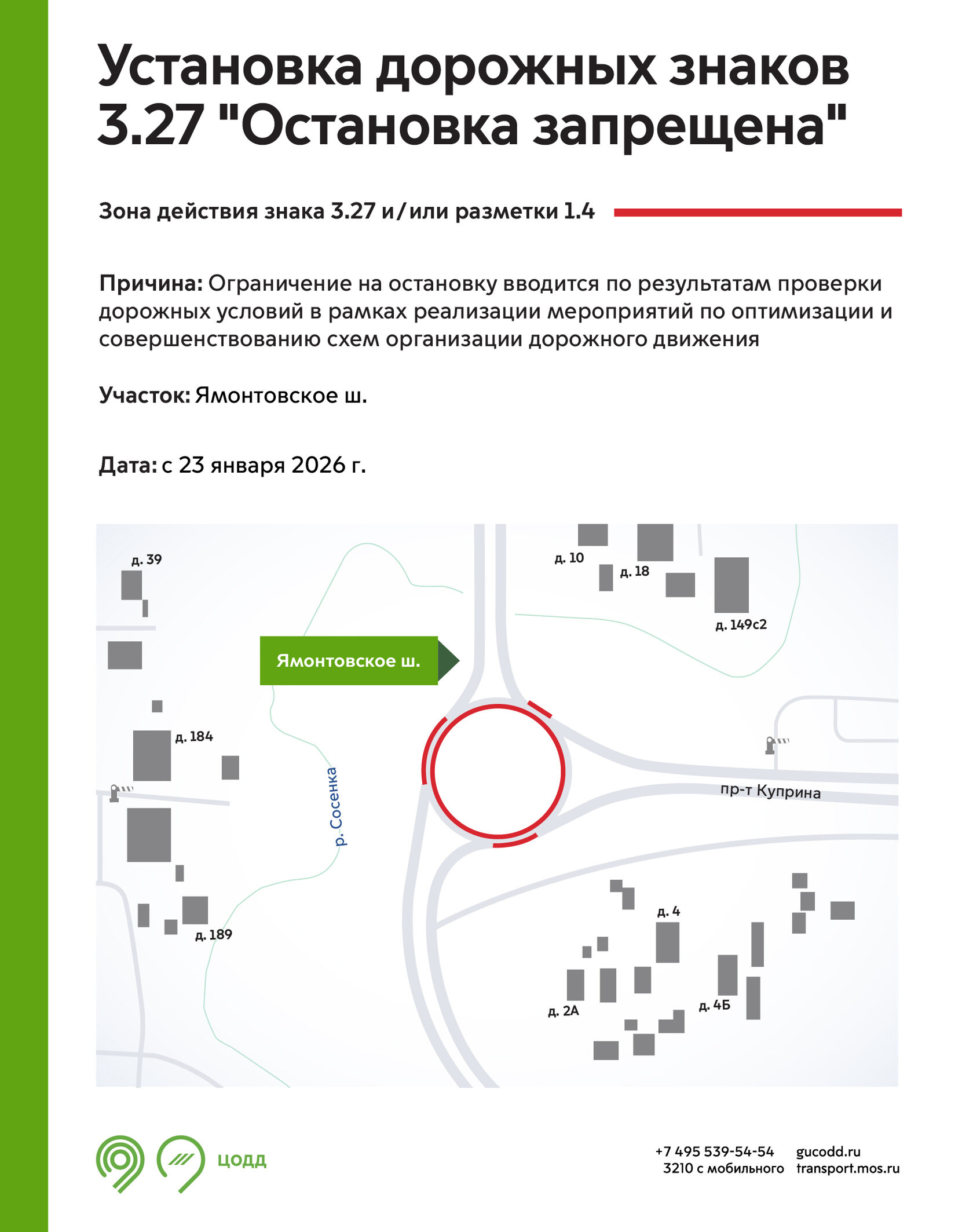 С 23 января 2026 года на Ямонтовском шоссе в ТиНАО начнет действие знак 3.27 «Остановка запрещена».